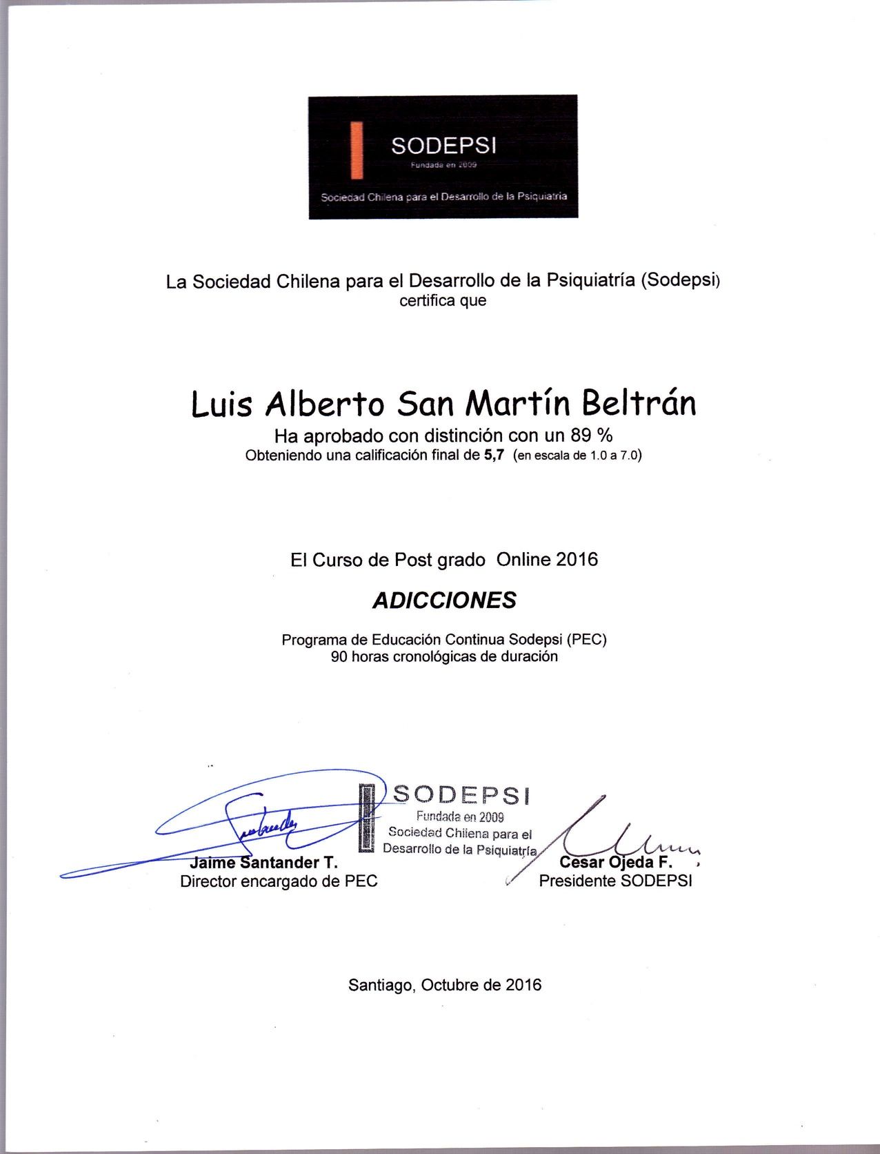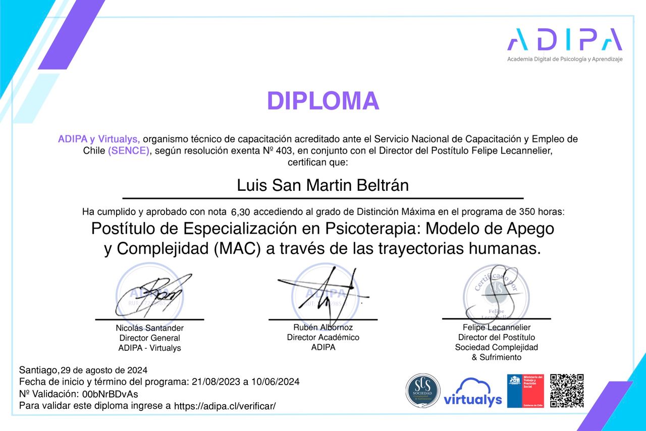 Me formé como psiquiatra en la Universidad de Chile y, posteriormente, he continuado perfeccionándome constantemente, profundizando en el conocimiento de los problemas de salud mental y los trastornos psiquiátricos, así como en los distintos y mejores enfoques terapéuticos.